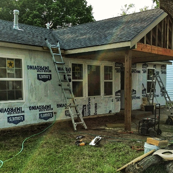 The house after new siding, roof porch, and driveway were added. Full House Remodel from top to bottom.